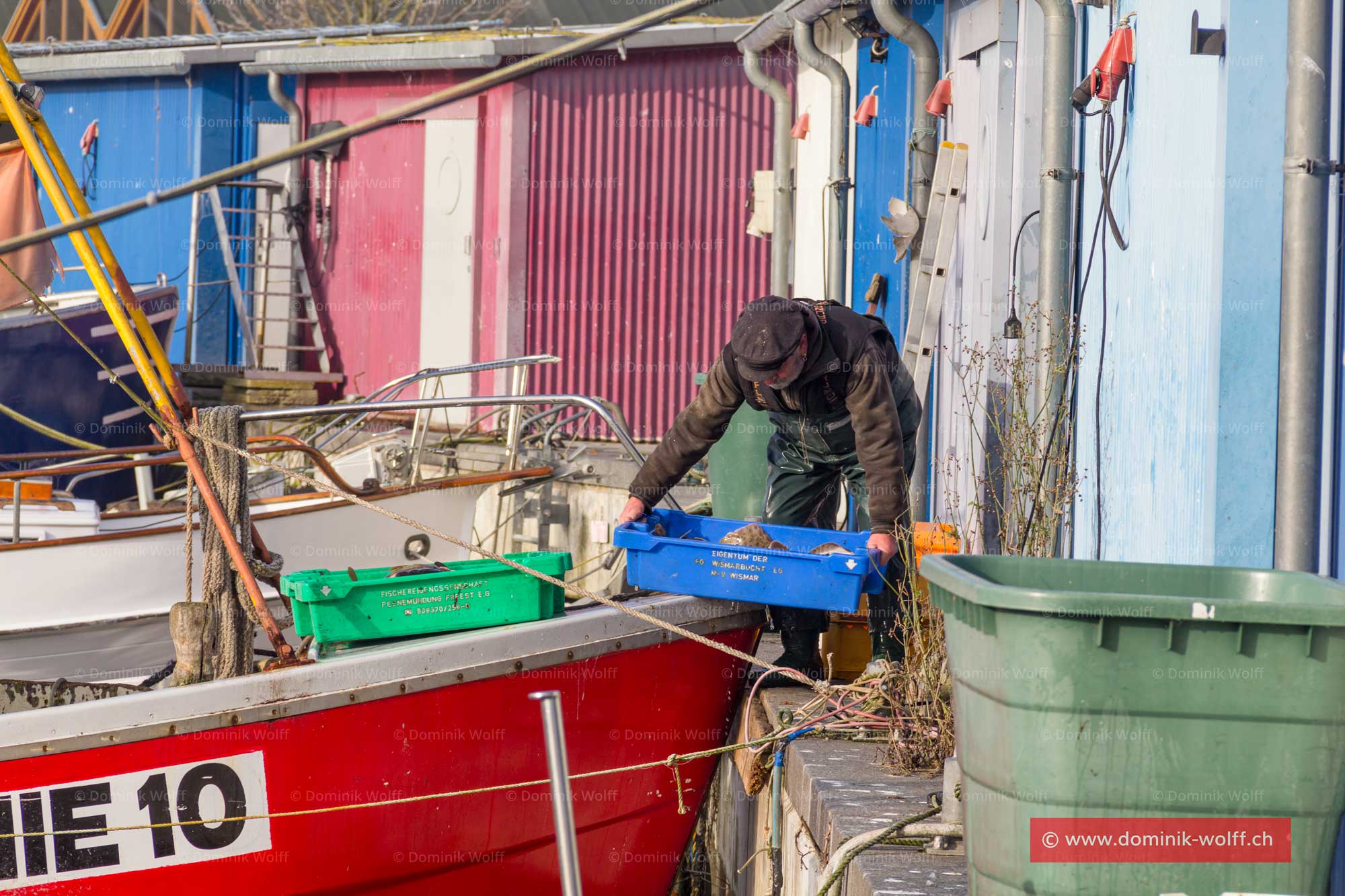 Ein Fischer bringt seinen Fang direkt vom Fischkutter in den Fischverkauf im Niendorfer Hafen in Timmendorfer Strand