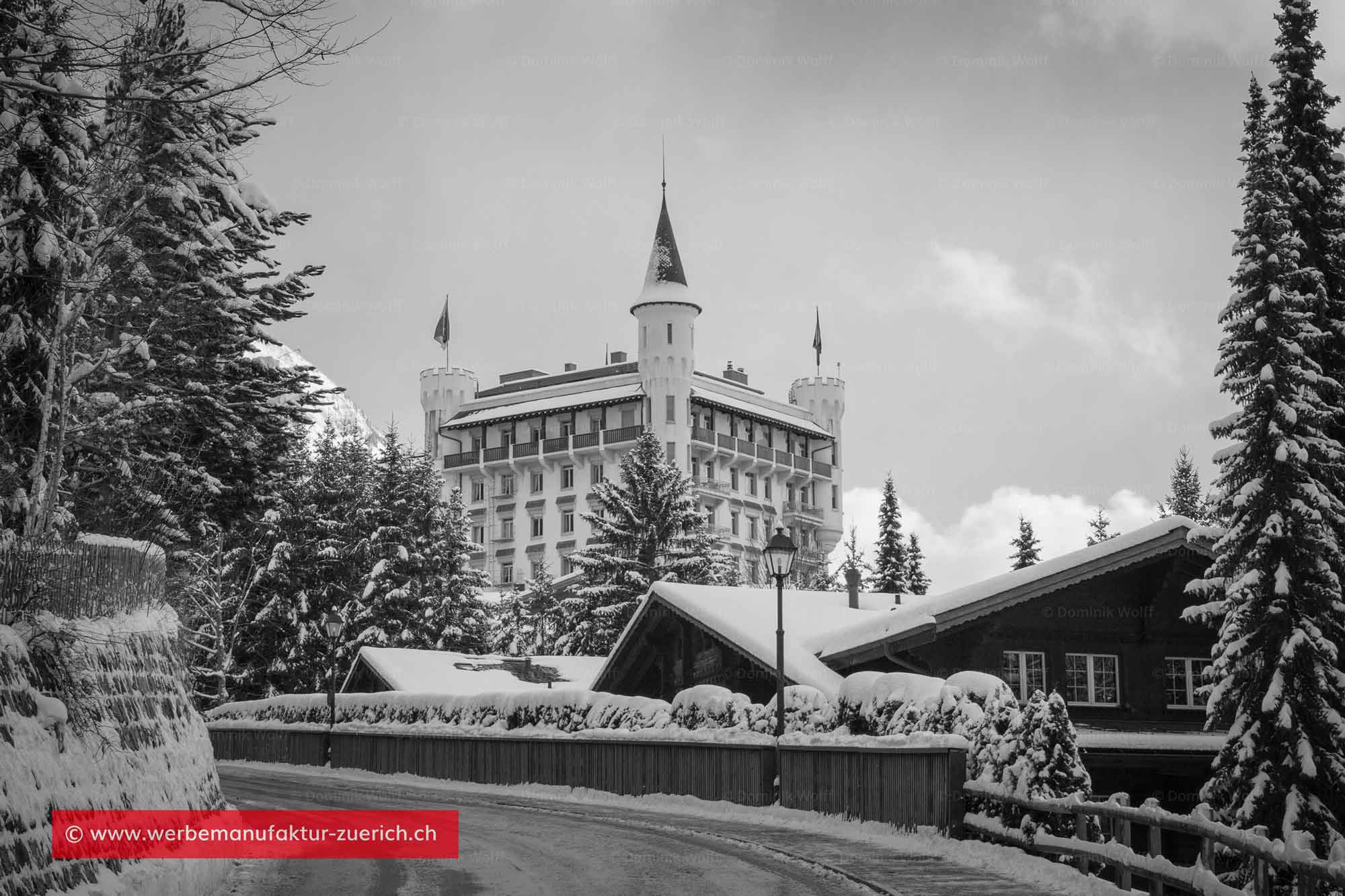 Winter in Gstaad Oberbort. Auf diesem Panoramahügel befindet sich auch das Luxushotel Gstaad Palace.